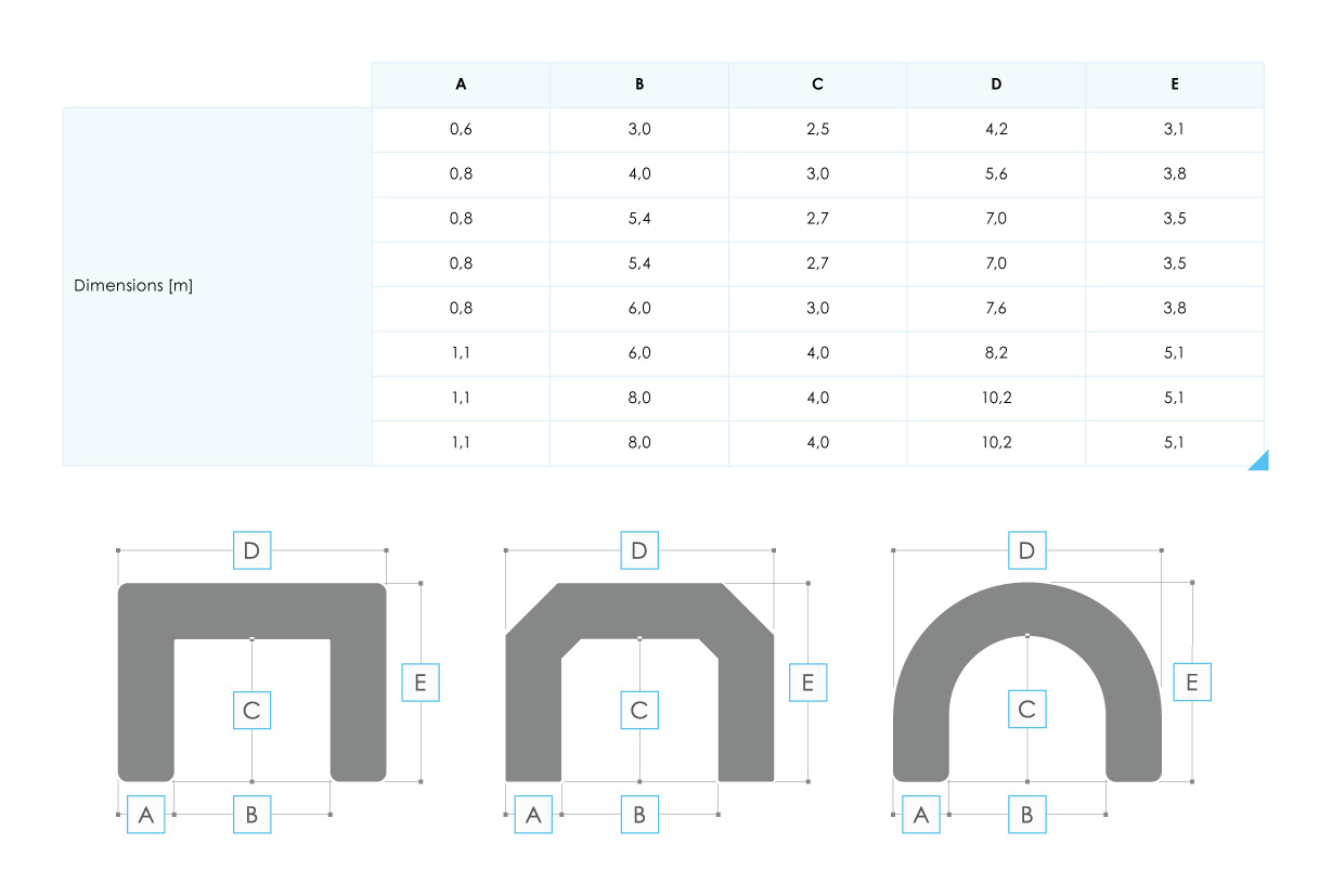 Three shapes of custom inflatable arch are available: rectangular, polygonal and arched. Each AirBlock custom inflatable arch can be additionally equipped with practical skids, which increase stability and minimise the risk of the structure tipping over in strong winds. Standard sizes range from 3.0 to 8.0 metres, allowing for easy adaptation to most spaces and applications. For non-standard requirements, it is possible to manufacture structures with custom dimensions