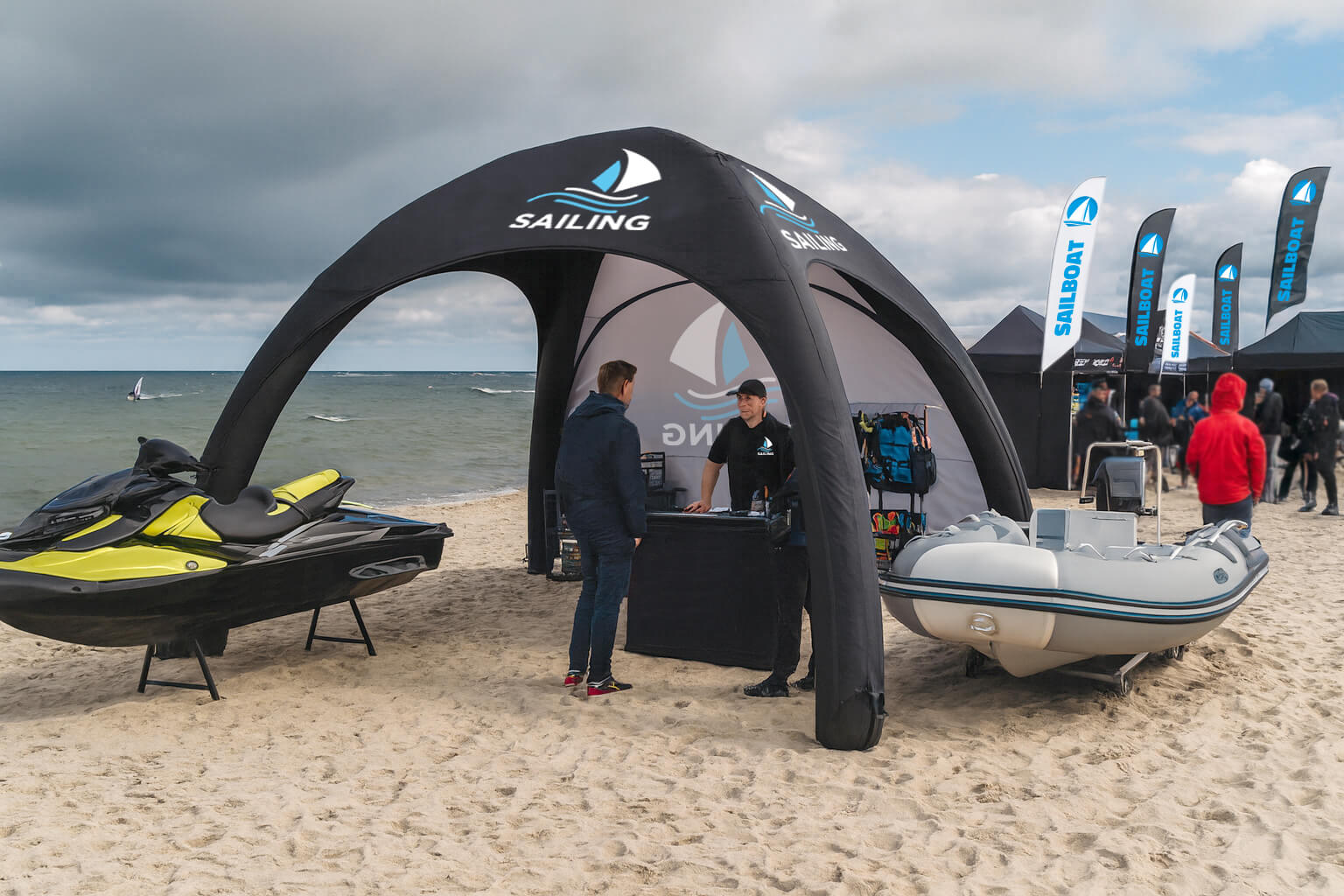 Thanks to these additions, the inflatable tent becomes an attractive space for potential customers and a comfortable workplace for staff.