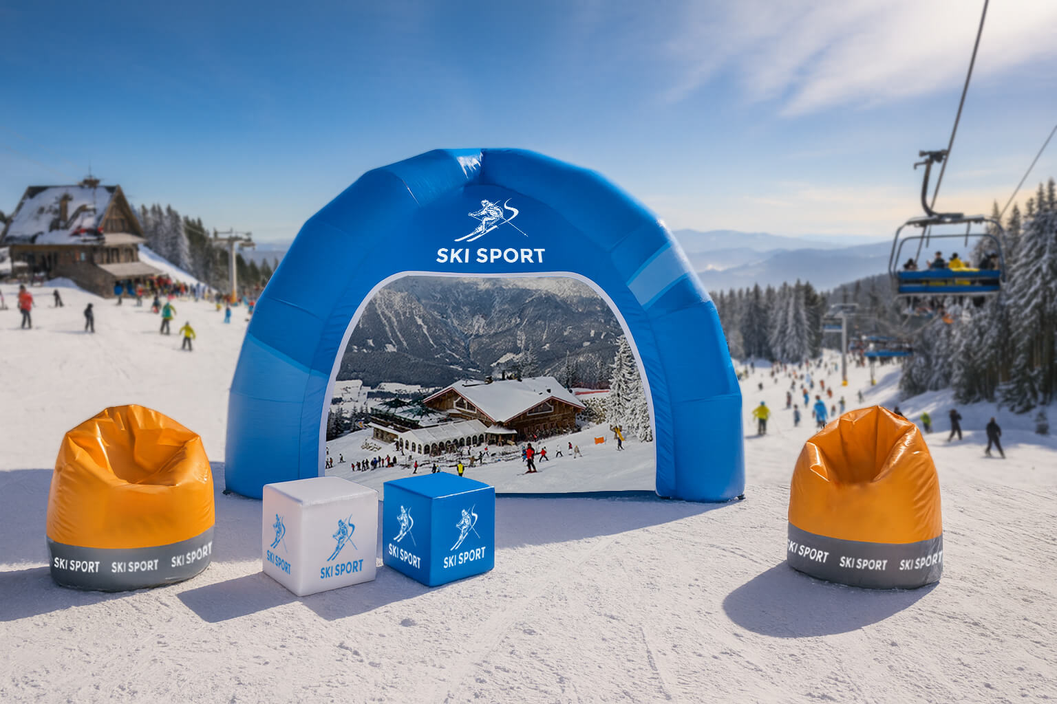 As standard, the outer shell of the inflatable tent dome is designed from polyester fabric with a weight of 235 g/m², with sublimation printing. This material is flexible, durable, and weather-resistant.
