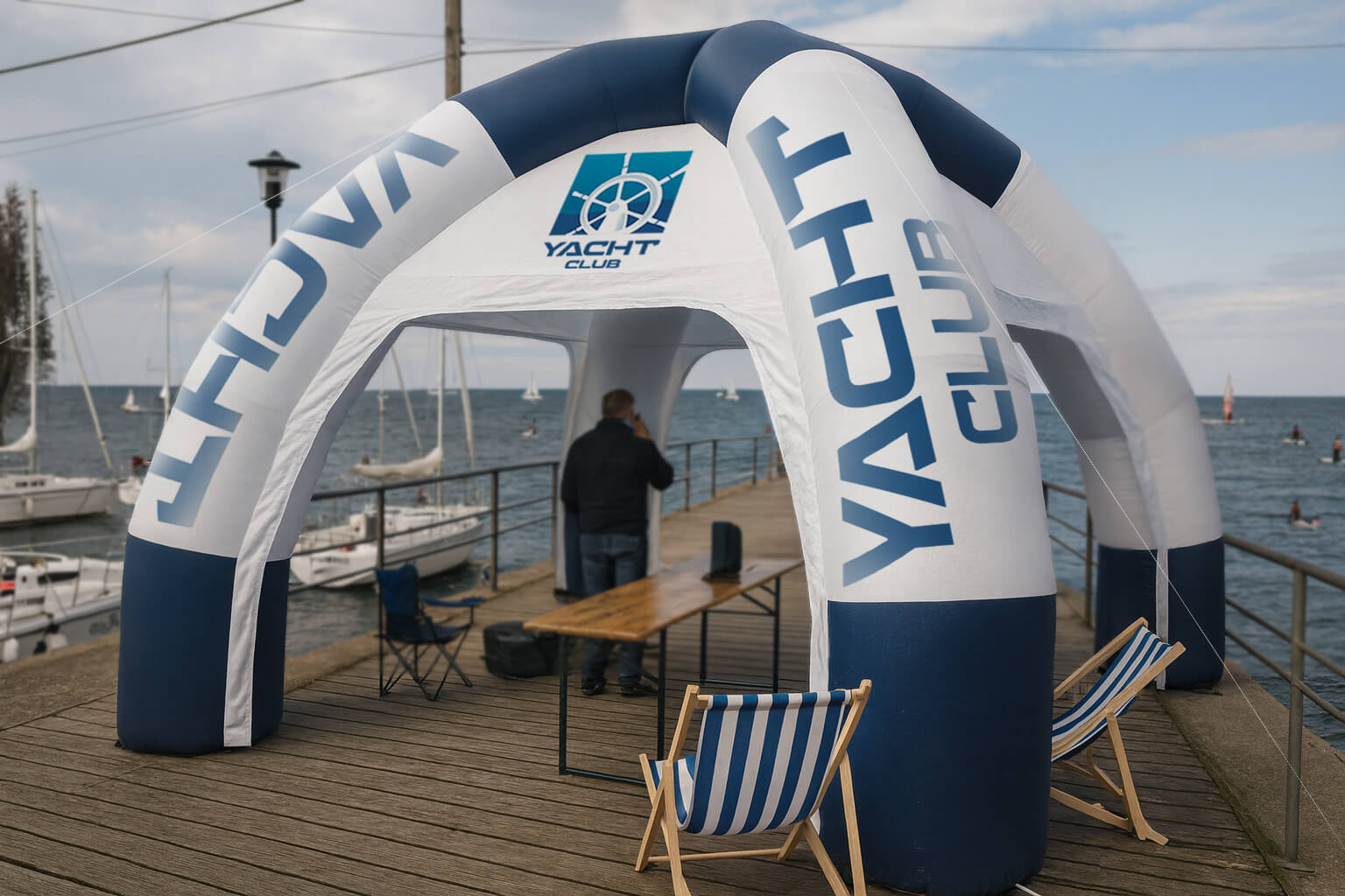 In its basic version, the custom inflatable tent consists of a supporting structure and a roof, but it can be expanded with full walls that create additional advertising space. Optionally, the advertising tent can also be equipped with PVC film windows that let in natural light and doors that increase its functionality. All types of walls are fastened with zippers, which ensures great flexibility of configuration – depending on the needs of the event, the tent can be fully closed or remain an open, more accessible space.