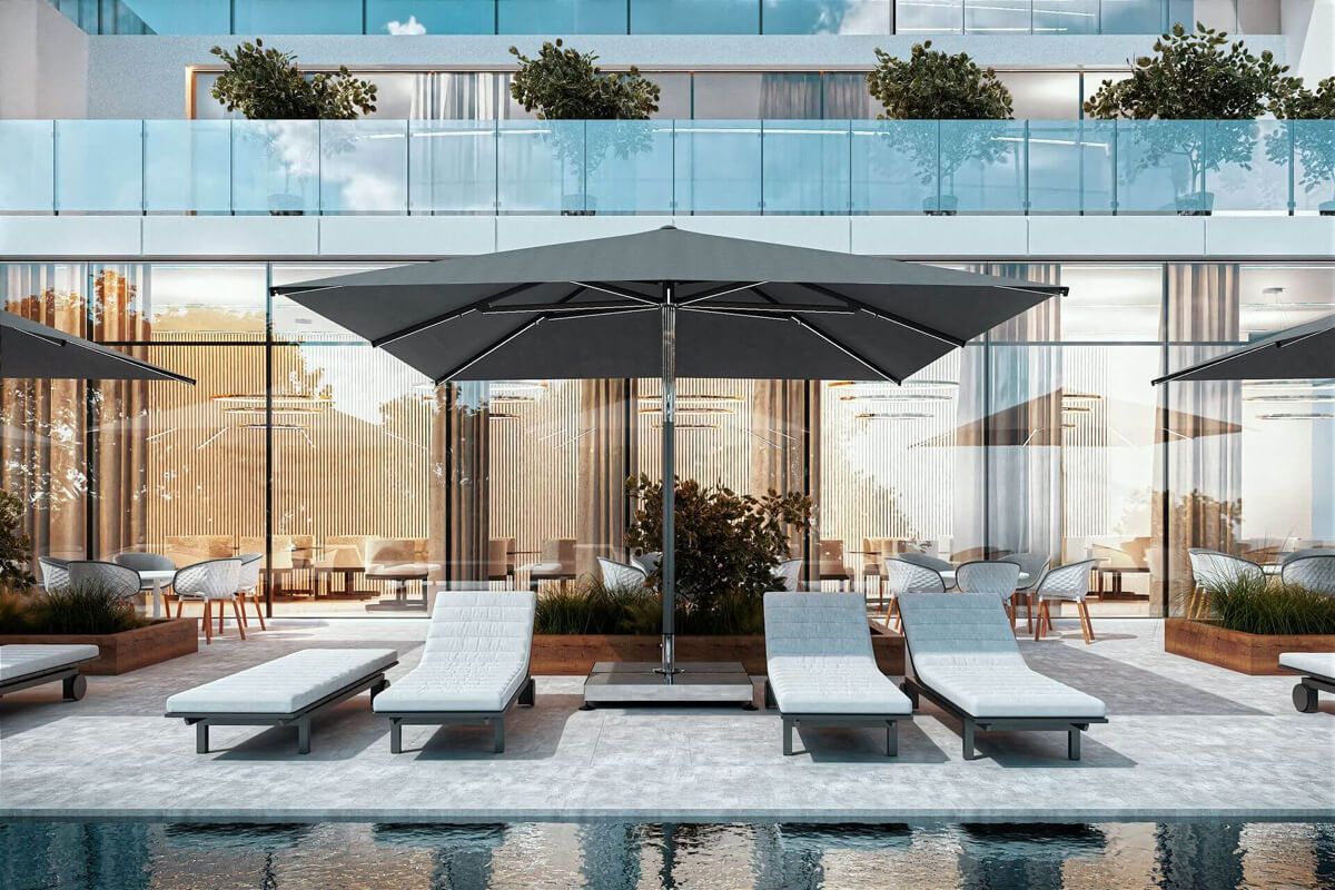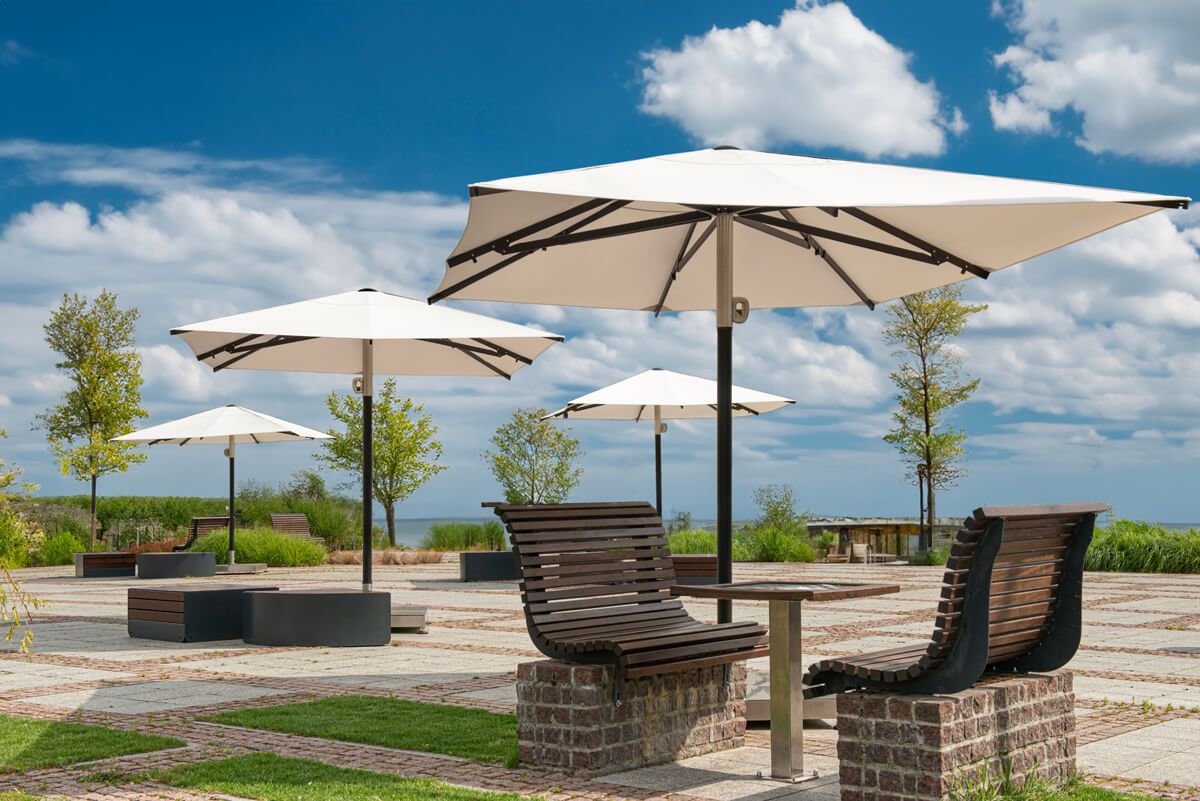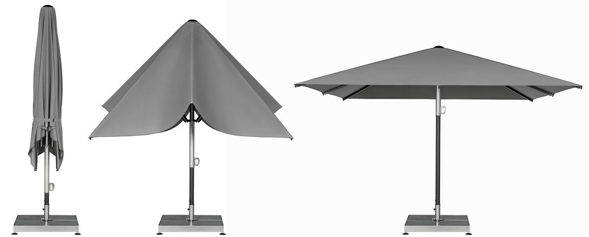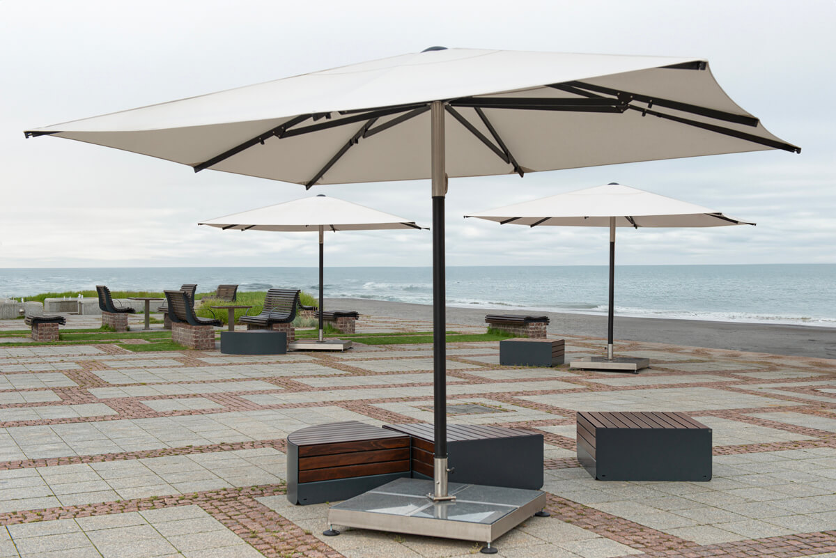 Atlantic parasol comes in three possible canopy shapes – octagonal, square and rectangular. Sizes vary from 3 to 5 meters and the square-shaped canopy line offers the greatest variety of them. Atlantic parasol’s frame is made of anodized aluminum, all in mysterious, interesting black colour. Polyester canopy in a special, dynamic shape, serves as a perfect space for branding and individualization of the product.