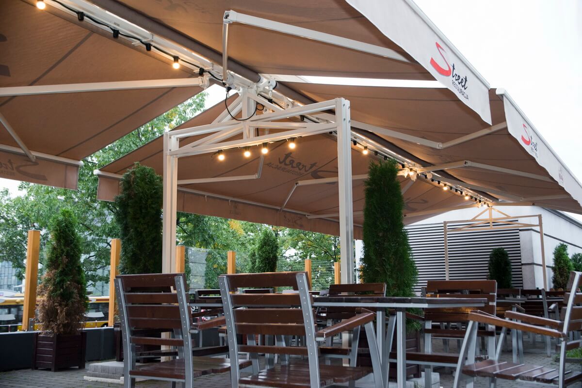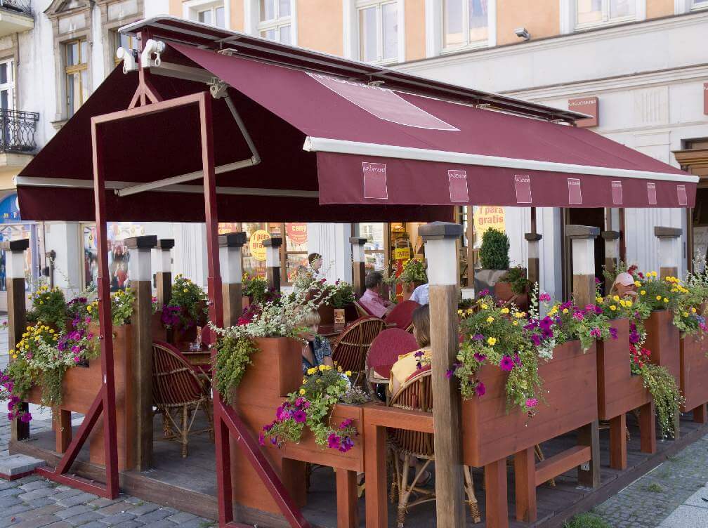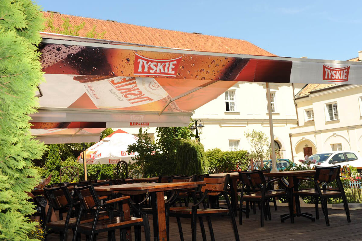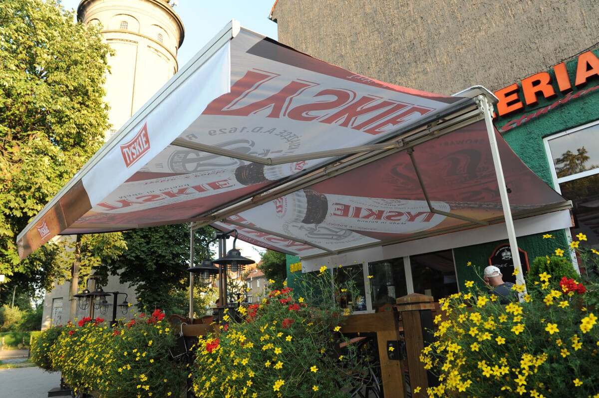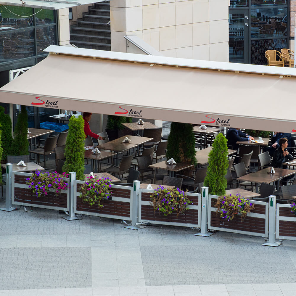 The Duetto Classic awning consists of 2 retractable awnings with a cover made of acrylic fabric, characterised by high resistance to external factors. It provides effective protection from the sun and rain. It provides pleasant shade, increasing the comfort of your guests. The frame is available in 3 colour options – white, cream and brown. Its additional advantage is the possibility of personalisation. We offer the possibility to print it according to your individual design. Duetto Classic serves not only a practical but also an advertising function.