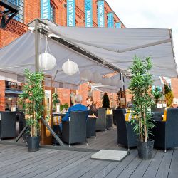 - Practical freestanding awning, ideal for restaurant gardens, without the need to mount to the building façade.