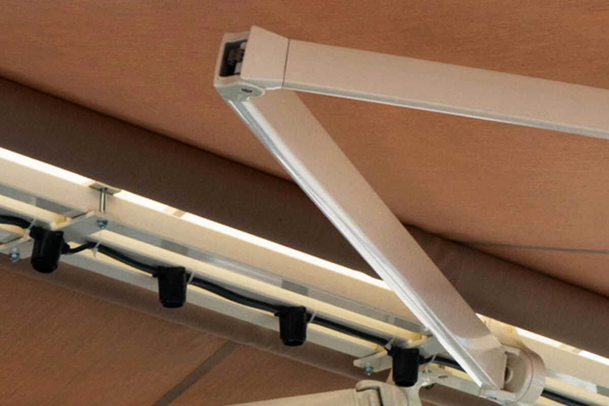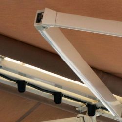 Options:Electric motor, LED lighting in the arms, Steering remote, Telescopic supports to reinforce the awning structure – cannot be used with the weather station, Weather station