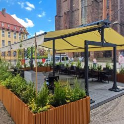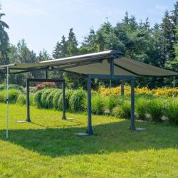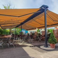 Freestanding or ground-anchored awning, ideal for restaurant gardens, does not need to be attached to the building wall.