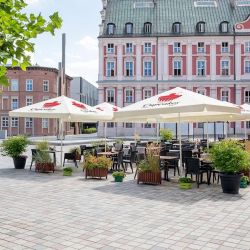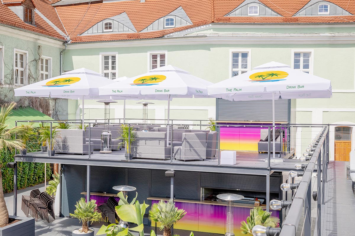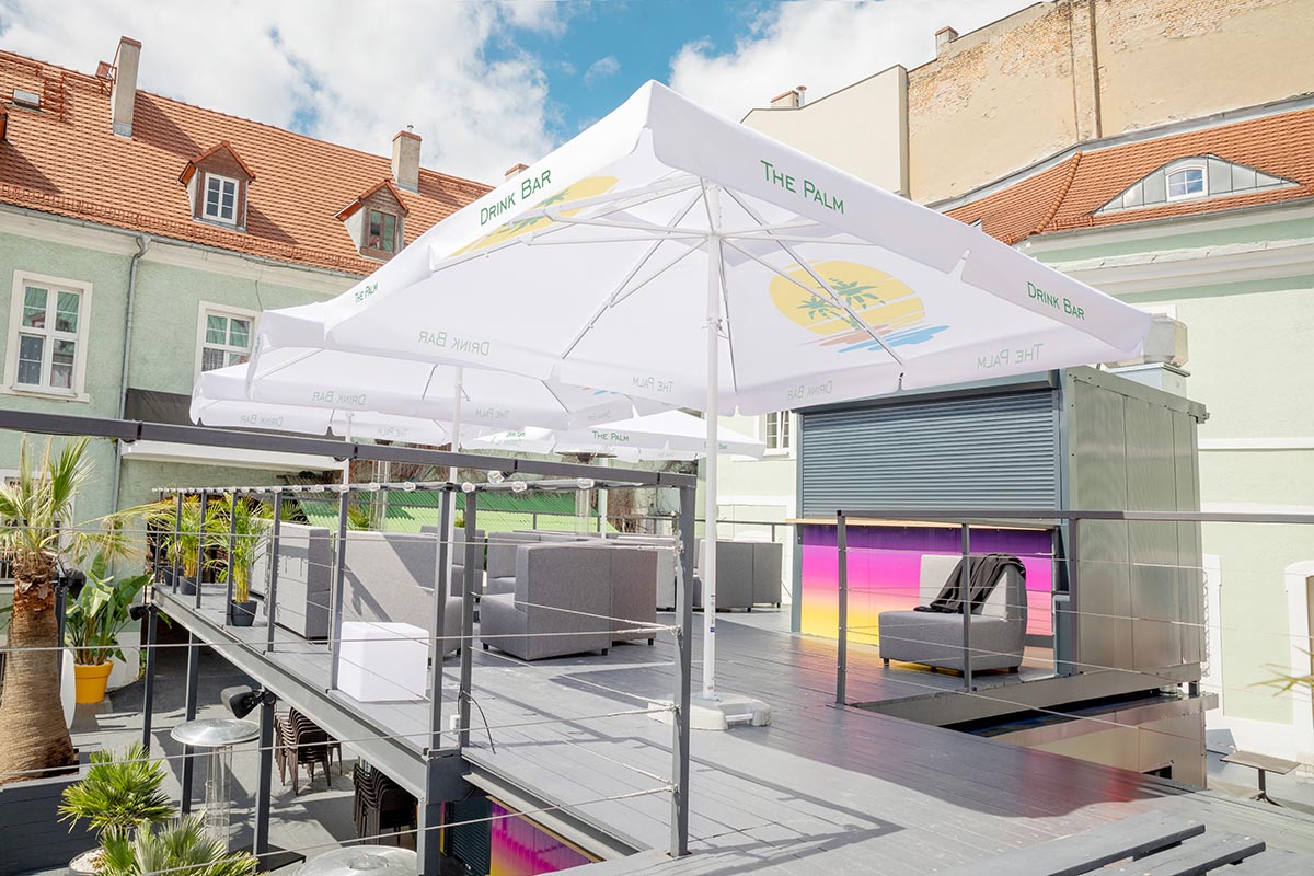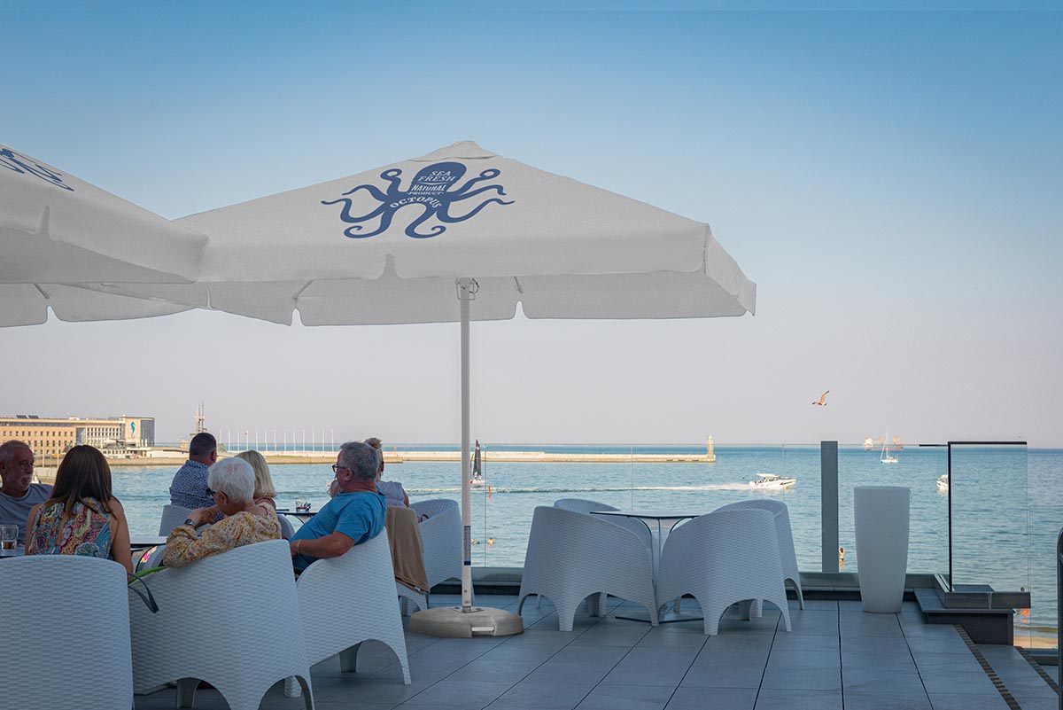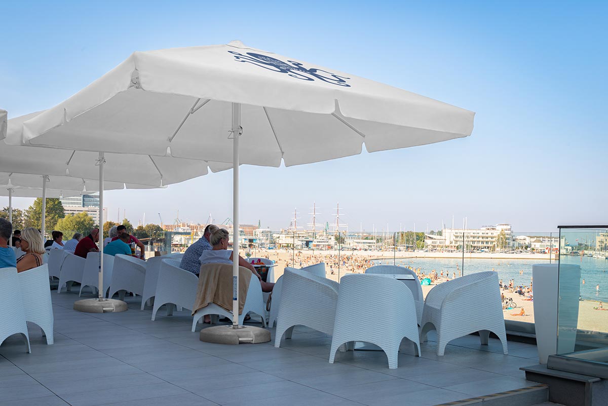 Due to its construction, including eight arms and a central leg placement, the parasol is an ideal medium of advertising for every company or brand to be advertised during events in the open air. Its stable construction is secured with the use of high quality aluminium. Thanks to monochromatic colours of white and grey in the stand and base, it is also elegant.
