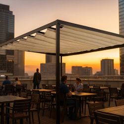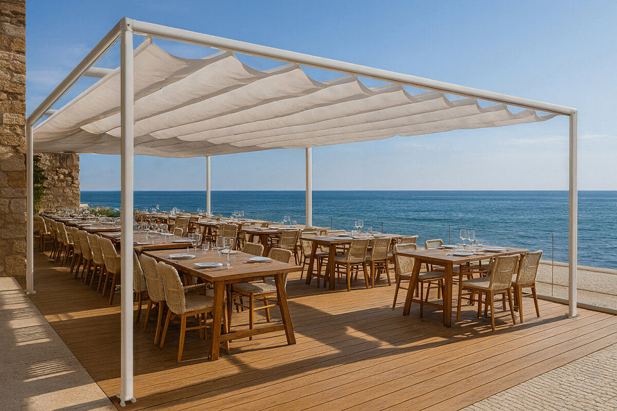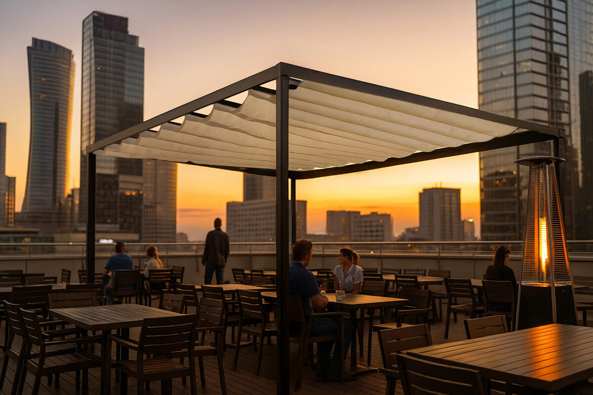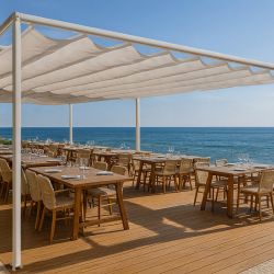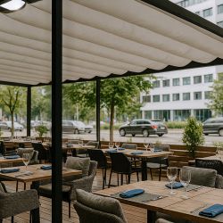Aluminium Pergola Standard is a simple and functional protection against the sun. Construction is made of lightweight and durable aluminium profiles. Roman type opening roof is made of very durable acrylic fabric used for production of awnings. The system allows to be mounted to elevation of a building or to be used as free-standing pergola tents.