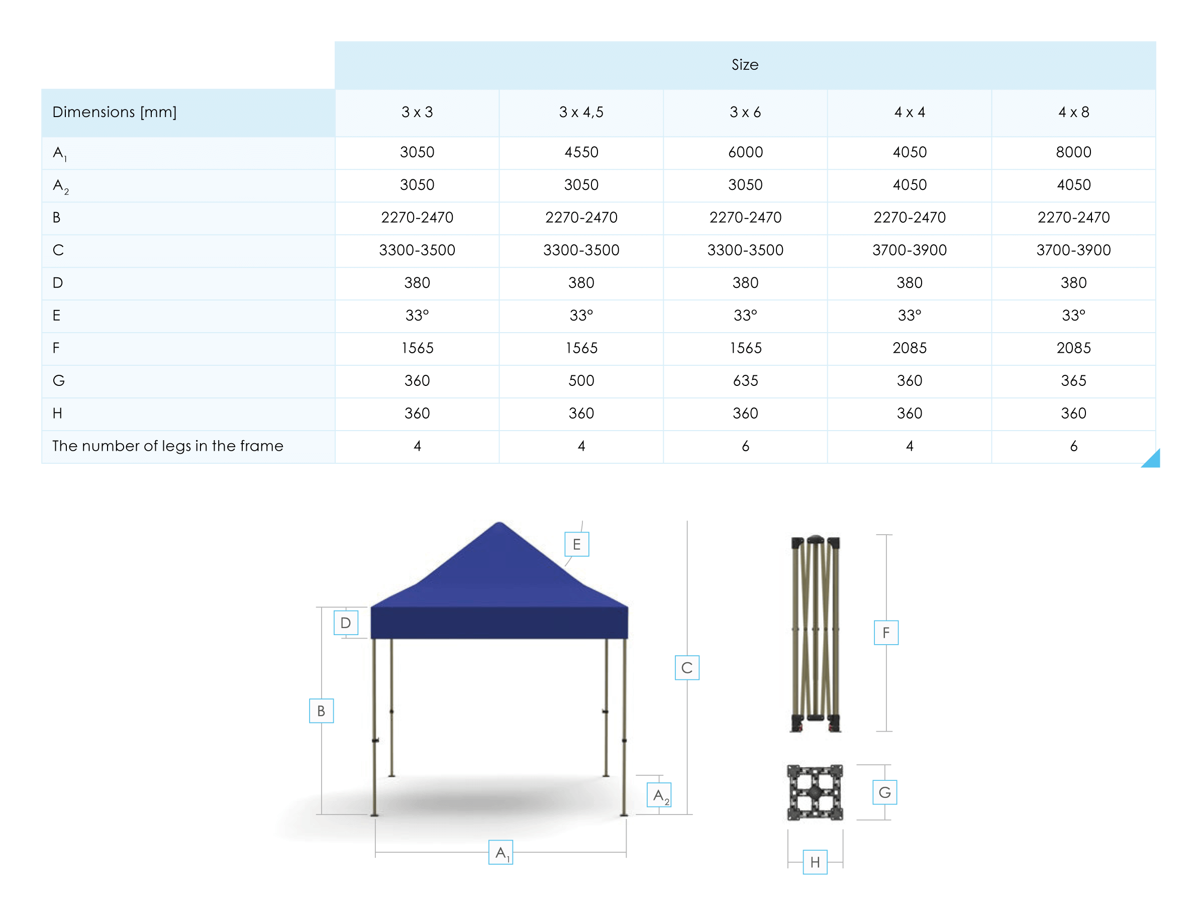 Available in sizes from 3×3 m to 4×8 m, the Plus version of the express Outdoor gazebo tent offers a wide range of configurations – much wider than the Standard version.