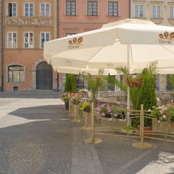 The construction offered in Strong line of advertising of parasols makes the product resistant to the wind of strength equal to 3 degrees of the Beaufort Wind Scale. This ensures both the safety of the Customers directly using the product as well as their comfort in such places, where a protection from strong wind is necessary. The Strong line parasols come in two possible shapes of canopy – octagonal and square. Litex Promo offers a wide range of possible sizes for square canopies – ranging from 3 to 5 meters. The octagonal canopy is available only in one size – a large, 5.5 meters. The opening system relies on telescopic handle. Frames are aluminum, coming in classic white colour. The Strong line parasols’ canopy is polyester. Litex Promo offers printing the logo, slogan and other elements of visual identification, according to the needs of Client’s marketing campaign, using digital of screen printing technology.