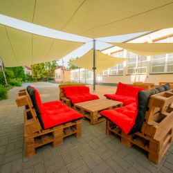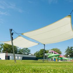 Steady and safe construction of this shade sail makes an avantgarde and eye-catching installation. Its aluminium shade sail frame is equipped with height and material draw regulation systems. The construction allows for a quick and easy mounting and dismantling of the fabric and it can easily adjust to weather conditions. Thanks to its unique shape and properties of the used materials, this shade sail square can be fixed to an elevation or to the ground.