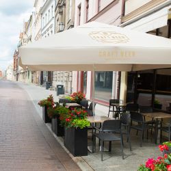 Telescopic advertising parasols manufactured and branded by Litex Promo make a great way to draw the attention of the customers. The canopy of Litex Promo telescopic parasol comes in two possible shapes – square or octagonal. The octagonal canopy size is 3 meters, while square comes in 3 possible sizes, ranging from 3 to 4 meters. Additional features of telescopic parasols are valance, valve or second roof. The frames are made of durable and solid aluminum. The canopy cloth is polyester.